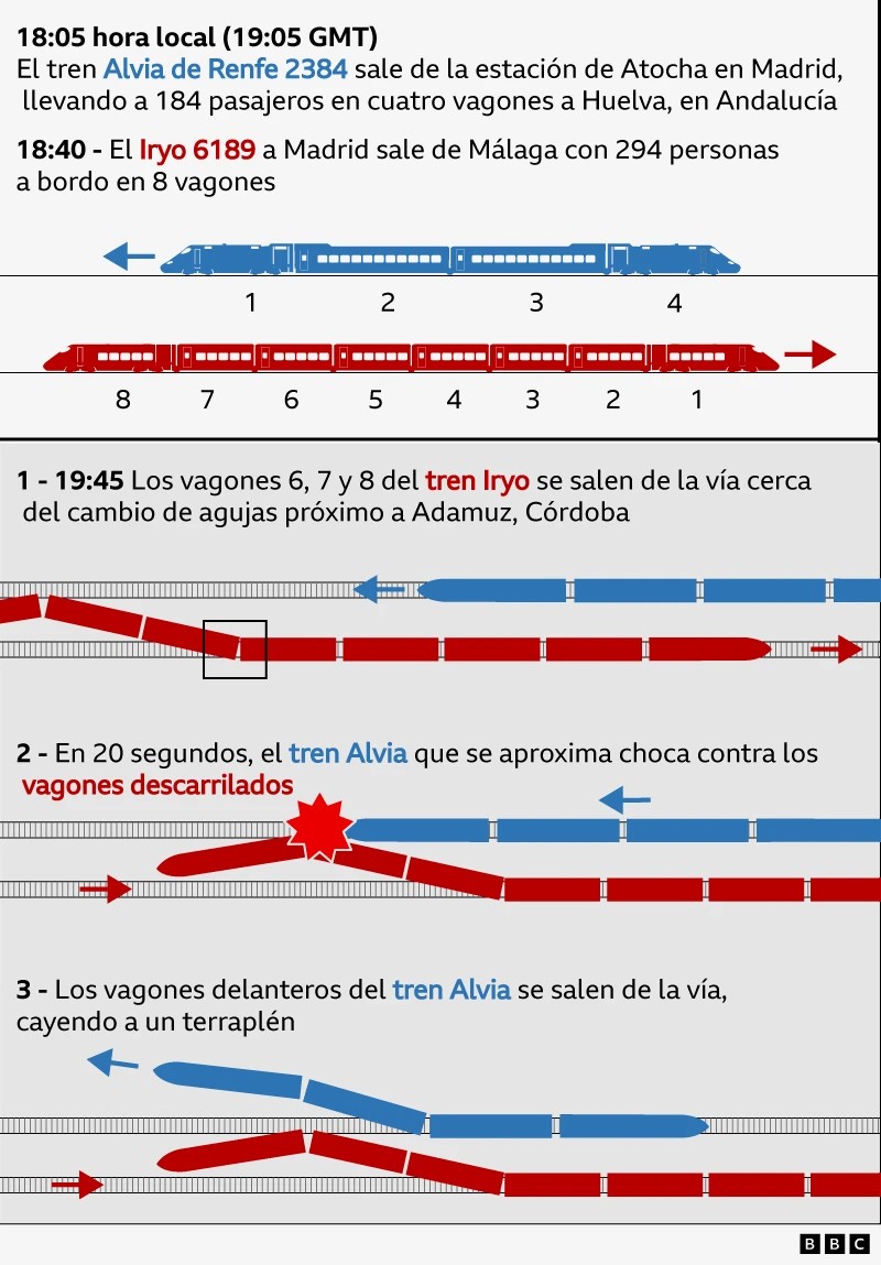 El choque se produjo a las 19:45 (18:45 GMT) del domingo, cuando los tres últimos vagones de un tren de la compañía Iryo que viajaba de Málaga a Madrid descarrilaron, chocando con un tren del servicio Alvia de la empresa estatal Renfe, que circulaba por la vía contigua en sentido inverso.
