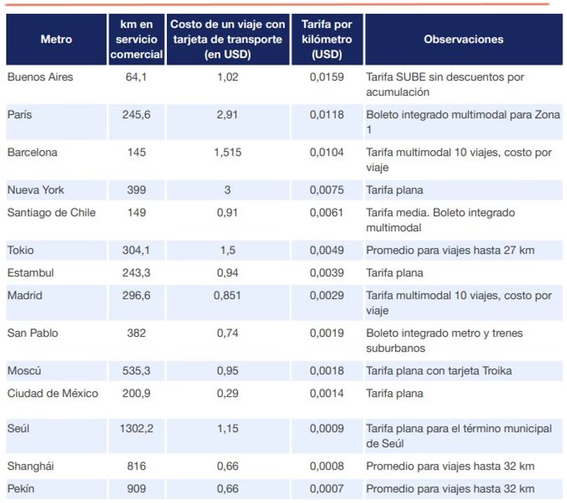 El subte de la Ciudad cuesta US$1,02 y cuenta con un recorrido de 54 km de extensión, mientras que el de Santiago cuesta US$0,91 con 149 km y en San Pablo US$0,74 con 382 km.